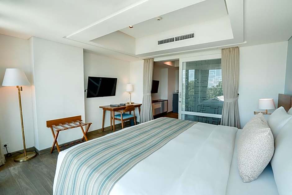 The Family Suite is superbly designed for comfort with a unique artistic twist. This room is comfortable for accommodate up to 5 guest that facilitated with a bedroom and a sofa bed, also separated living room with a sofa bed. A complete kitchen utensil and pantry with dining table for the cooking necessity inside the room. Private balcony with a lazy chair completes this well-appointed room category.